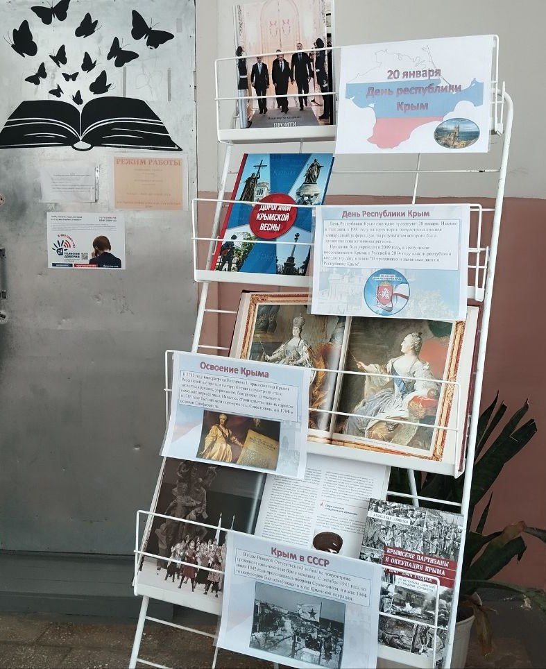 К знаменательной дате школьным библиотекарем Артемовой Еленой Михайловной в информационно-библиотечном центре была оформлена тематическая выставка литературы. Экспозиция включает в себя научно-популярные издания, исторические очерки, художественные произведения, фотоальбомы и картографические материалы, посвящённые разнообразной природе, богатой истории и многовековой культуре Крымского полуострова.
